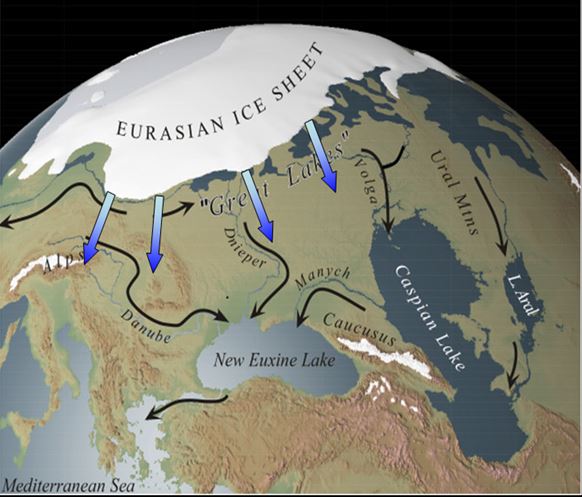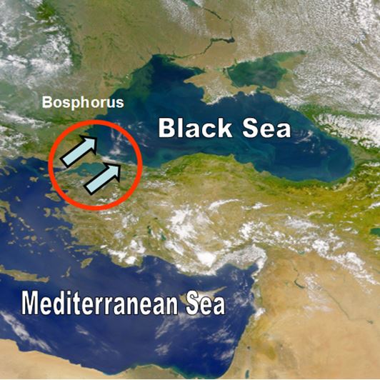 The rising Mediterranean waters surged over the now submerged Bosphorus Sill with the force of 200 Niagara Falls flooding both the fertile low-lying plains surrounding the Black Sea and the entire Middle East.